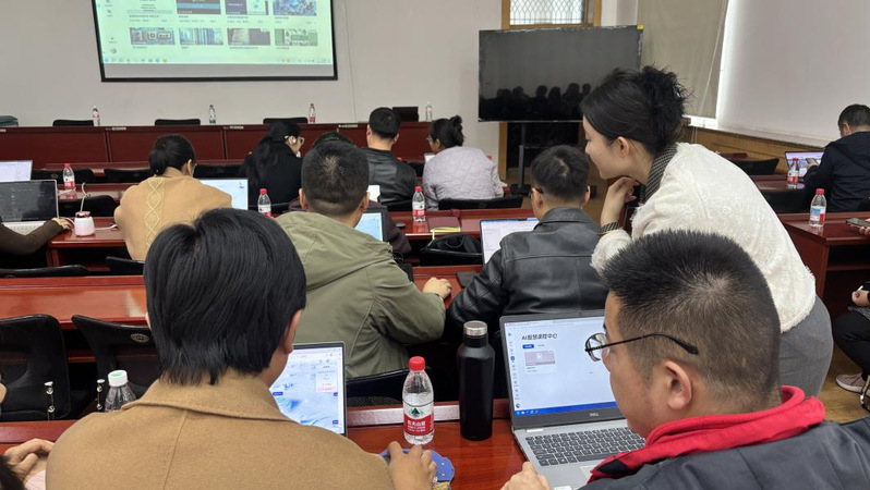 在实操环节,教师们现场体验了通过平台建设AI课程、创建AI助教智能体等核心功能,深入感受智能体在交互式教学与个性化辅导中的潜力。现场交流氛围热烈,与会教师围绕智能体与课程内容的融合路径、教学数据的挖掘与应用等问题展开深入讨论。